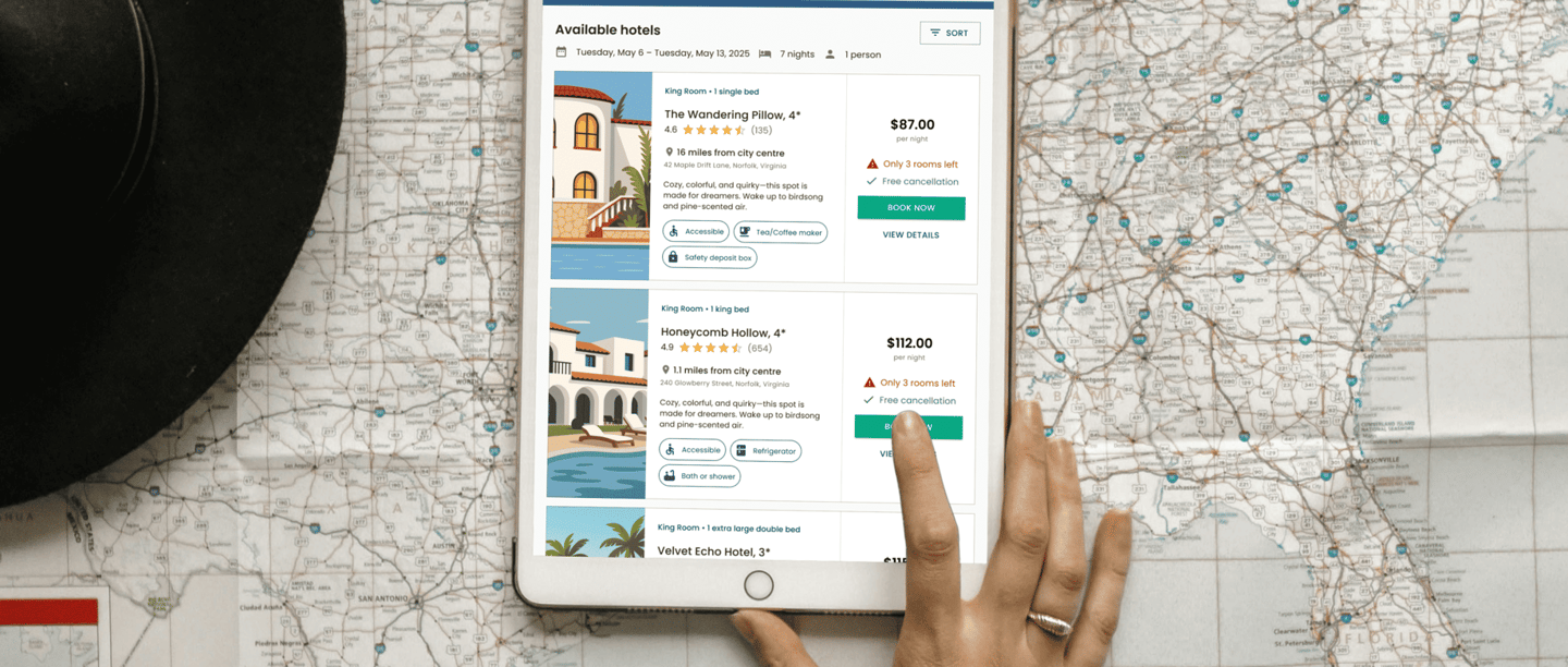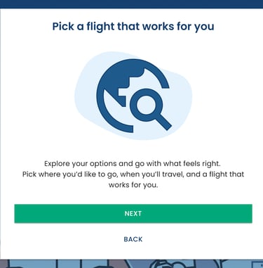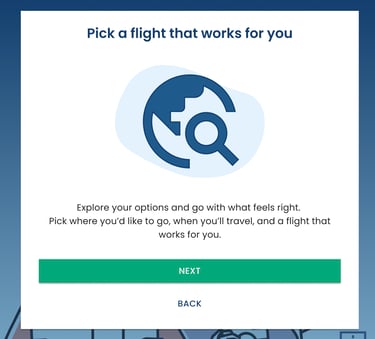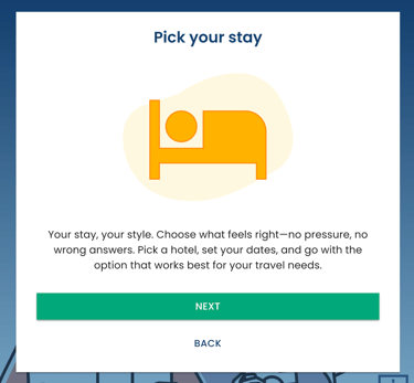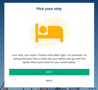 I added two lightweight intro screens “Pick a flight” and “Pick your stay” to explain the upcoming steps in a friendly, low-pressure way.