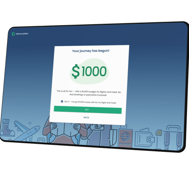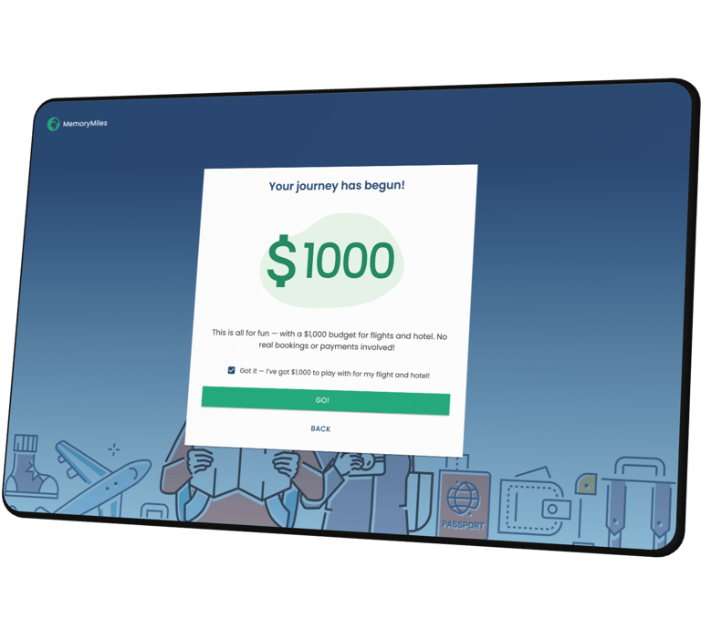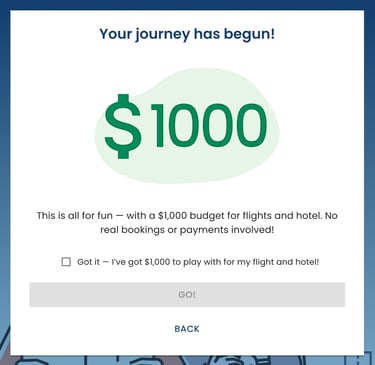 Then I anchored the flow with a $1000 budget gate - the “GO!” button stays disabled until the user acknowledges they have $1000 for the entire trip, because later choices (e.g., going far over budget) affect scoring and help clinicians interpret the final result.
